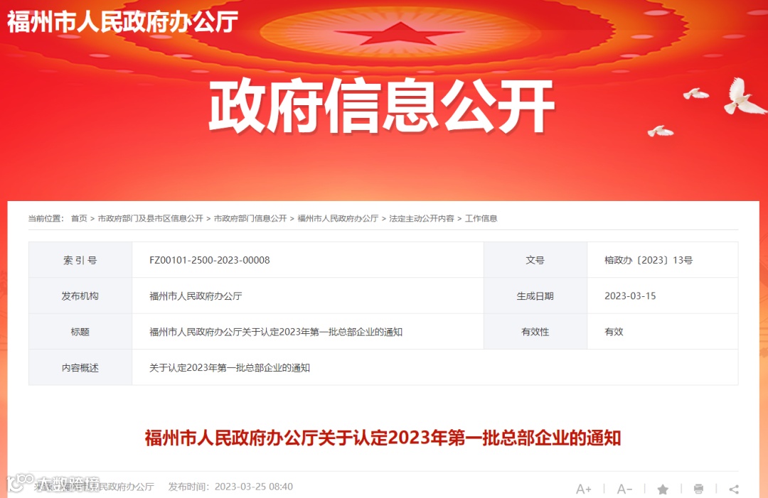 根据《福州市人民政府关于延续促进总部经济发展政策的通知》(榕政综〔2022〕59号)有关规定,经市政府研究,同意认定福建省人力资源服务有限公司等10家企业为我市2023年第一批总部企业,并按有关规定分别兑现扶持政策。具体名单如下: