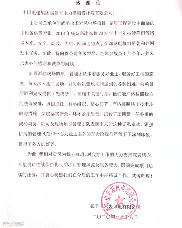 25台风机全部吊装完成,同时收到来自武平出米岩风电有限公司的感谢信。
