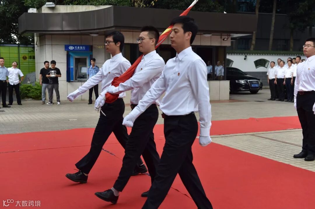 随着雄伟嘹亮的国歌声奏起,国旗手的右手上扬,鲜艳的五星红旗在空中舒展开来,全体人员齐声高唱国歌,目送国旗冉冉升起。