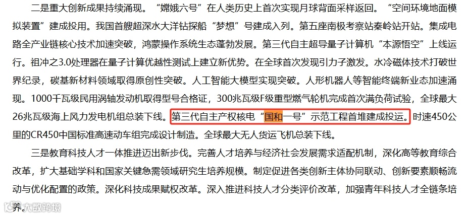 援引《财经》相关报道,《关于2024年国民经济和社会发展计划执行情况与2025年国民经济和社会发展计划草案的报告》全文中,在介绍2024年国民经济和社会发展计划执行情况的重大创新成果中指出,第三代自主产权核电“国和一号”示范工程首堆建成投运。