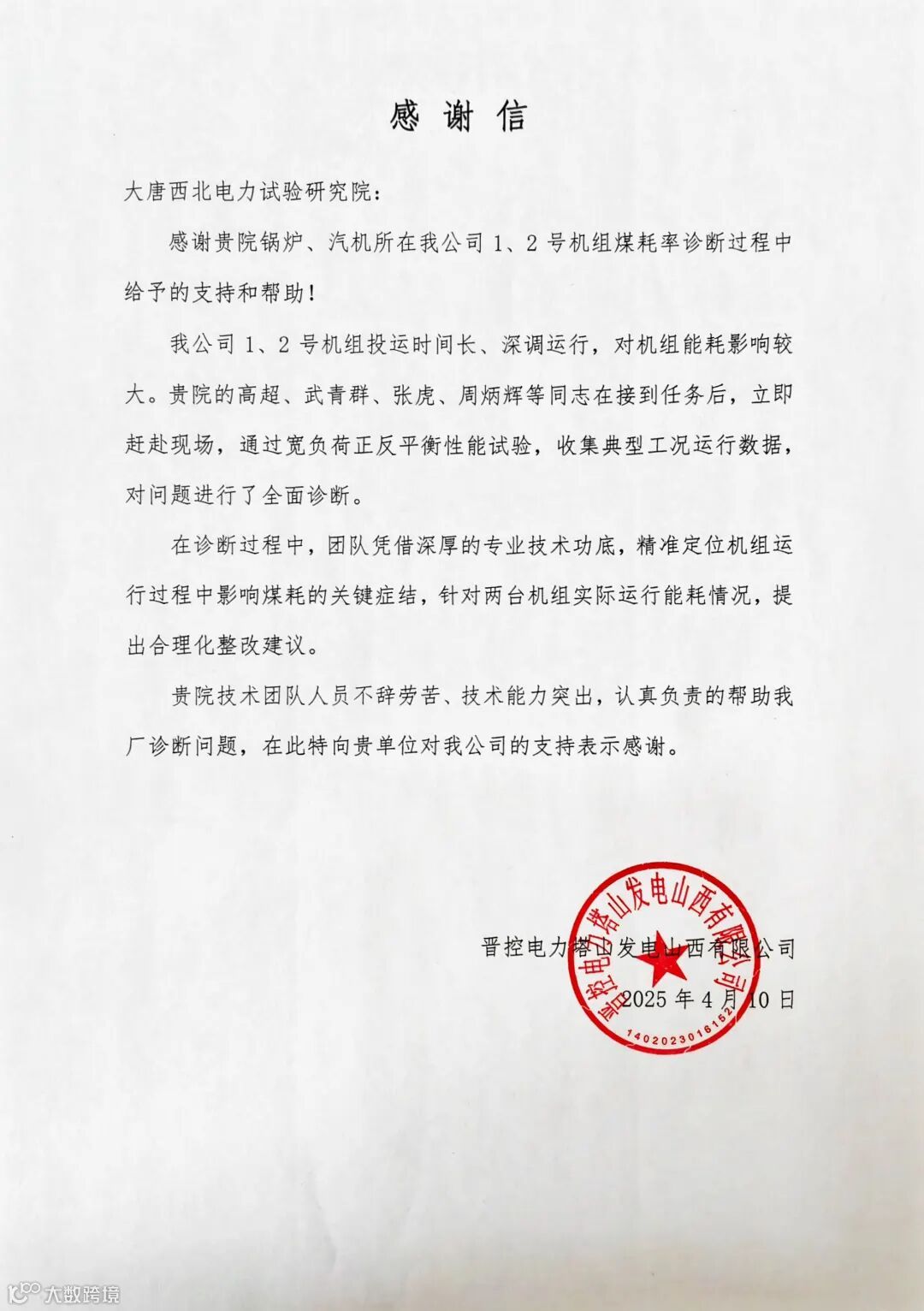 近日,西北院收到了一封来自系统外发电企业的感谢信,信中对该院锅炉和汽机研究所为其在煤耗率诊断方面的工作予以肯定和高度赞扬。