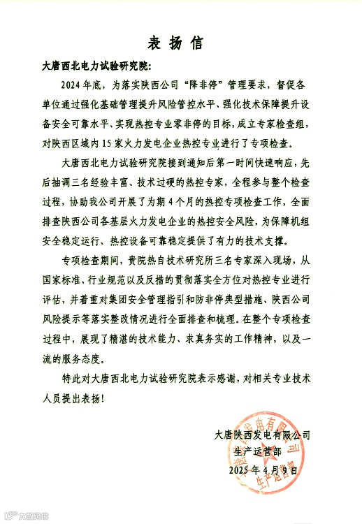 近日,西北院收到一封沉甸甸的感谢信,为该院热自研究所2025年开好局、起好步提振了信心。