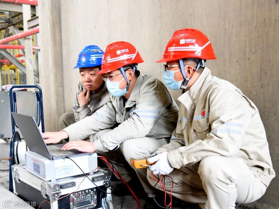 温福新、杜辉在彬长电厂大修现场进行1号厂用变压器绕组变形试验数据分析工作。