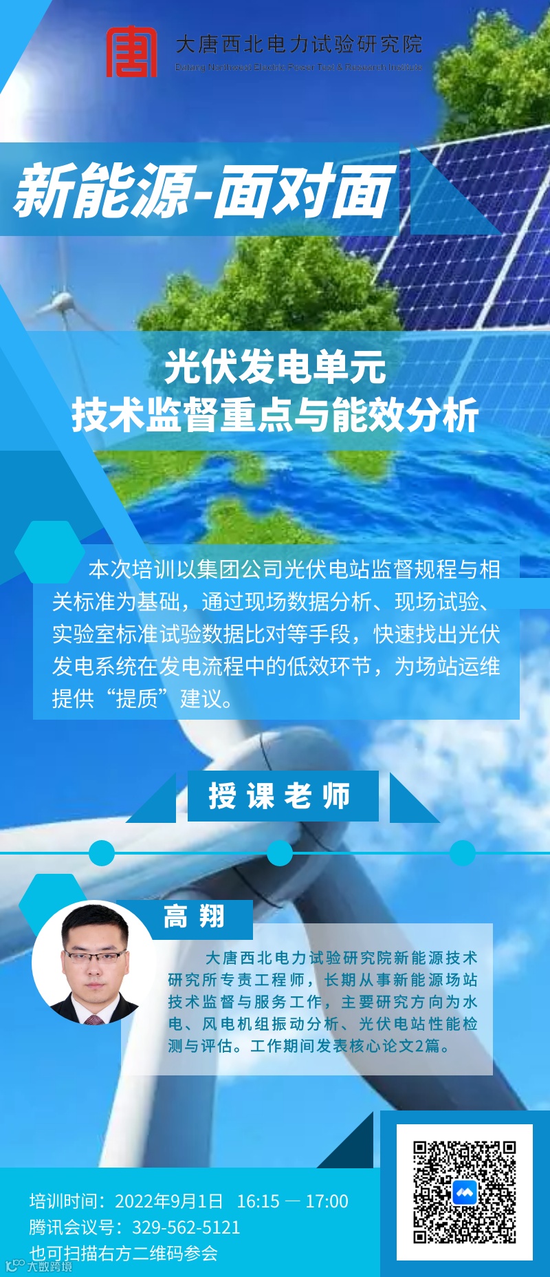 9月1日起,大唐西北电力试验研究院举办为期八期的风力发电和光伏发电技术监督专项线上培训,培训主要针对新能源公司技术监督管理人员、风电场和光伏电站技术监督专责及技术人员,旨在进一步规范新能源技术监督工作,提升新能源技术监督人员专业水平,提升技术人员的科学素养和技术素养,夯实技术基础,营造尊重科学、崇尚技术的良好氛围,确保新能源技术监督体系高效运行,合力攻坚共同建设完整严密的技术保障体系。