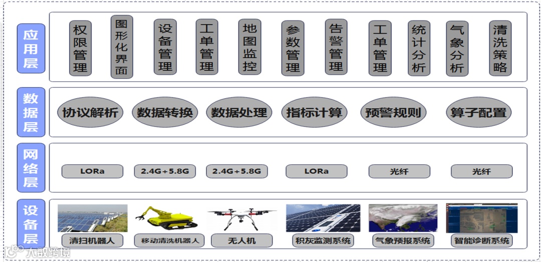 该系统针对西北区域光伏电站的恶劣气候,通过智能硬件终端、上位机可视化监控平台以及数据库等技术手段,实现了机器人智能清洁终端的远程状态监控、实时控制及系统数据的远程交互,并可通过无人机、光伏组件积灰预警系统、干挂式智能清扫机器人、移动式智能清洗机器人和光伏电站大数据平台故障分析与预警系统的联动,生成光伏组件清洁(含清扫与清洗)策略,并交由干挂式清扫机器人与移动式清洗机器人相互配合完成光伏组件的无人智能清洁操作。