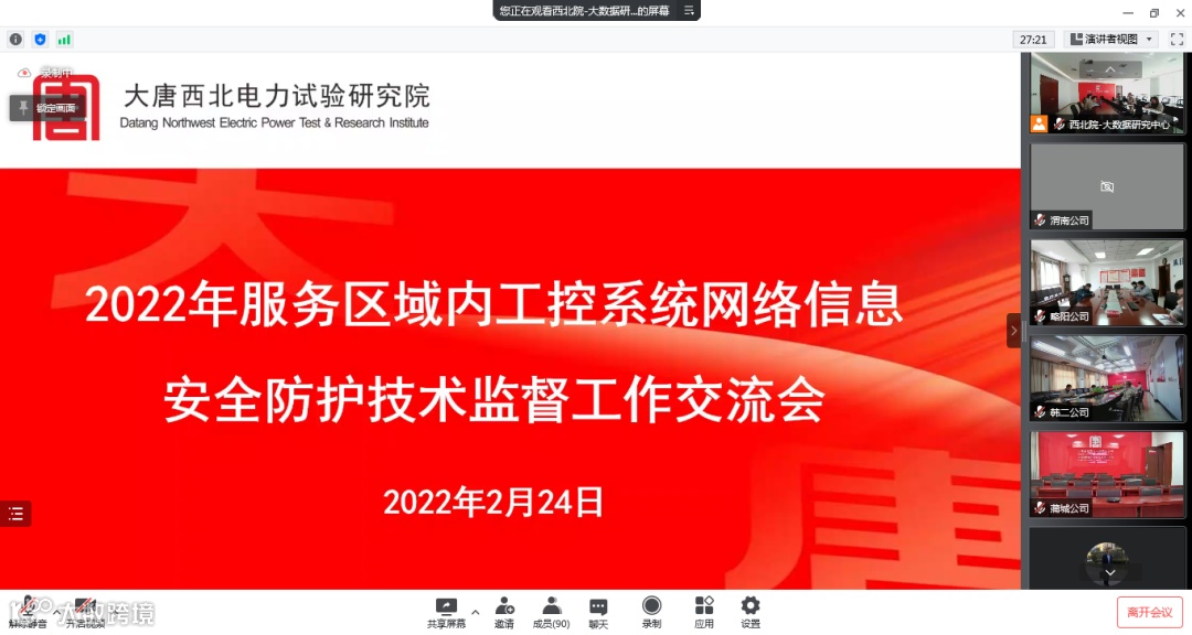 2月24日,大唐西北电力试验研究院大数据中心组织召开了服务区域2022年工控系统网络信息安全防护技术监督工作交流会,会议以线上视频会形式召开,各发电企业工控负责人,信息、热工、电气二次技术人员,以及服务区域新能源企业相关专业技术人员共计95人参加会议。