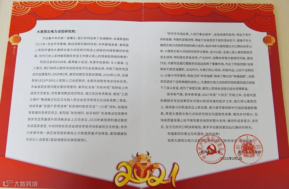 近日,大唐西北电力试验研究院收到紫阳县、县政府发来的感谢信,对该院在脱贫攻坚中的倾心帮扶表示感谢!