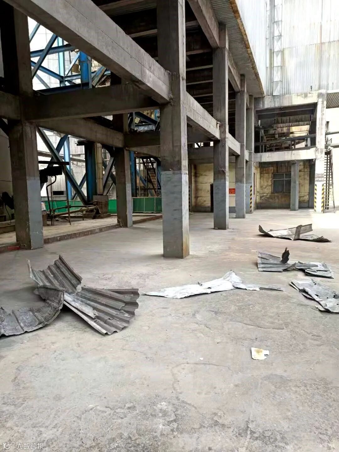 某电厂汽包上方防雨层铁皮破损、脱硫烟道外部保温层脱落严重,遇到大风天气,存在铁皮和保温棉掉落伤人的风险。