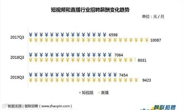 此外,数据还显示, 2019 年三季度,直播的平均薪酬为 9423 元/月,短视频为 7454 元/月。直播领域今年三季度的平均招聘薪酬较 2017 年三季度下降了6.59%,短视频则是提高了12.98%。直播行业中,直播运营、主播及主播经纪人的招聘薪资远高于直播助理和客服,前三个岗位在 2019 年三季度的招聘薪酬分别为 9893 元/月、 9697 元/月、 9084 元/月。