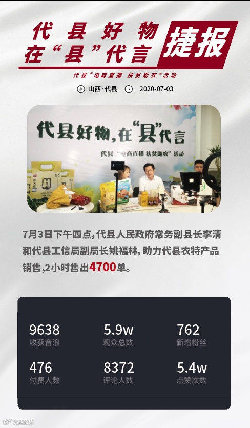 2020年7月3日下午,由代县人民政府主办、代县工业和信息化局、代县电子商务公共服务中心等相关部门承办的“电商直播 扶贫助农”代县名特优产品专场直播活动圆满落幕。