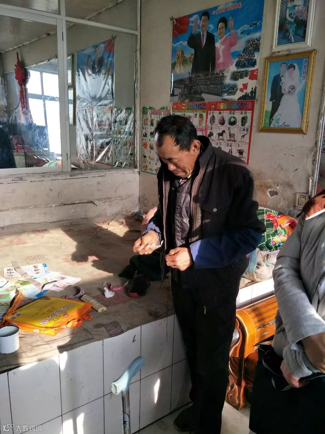 从上面这张图片中我们可以看见屋子里面的家具用品很少,柜子的门已经没有了,改用纸壳挡着里面的东西,我们不难发现屋里面所有的用品都是很久以前的。跟着主人进了他们的房间,屋里面非常乱,墙面已经掉皮了,炕上面很简单的铺着一张很破旧的炕单。这位大爷正准备给自己的小孙子缝鞋,听他说孙子的鞋刮了一个口子,鞋子缝上还能穿,不舍得扔。听到这些,我能感受到或许不只是农民的朴素,更应该是经济水平让他们比别人更节省。