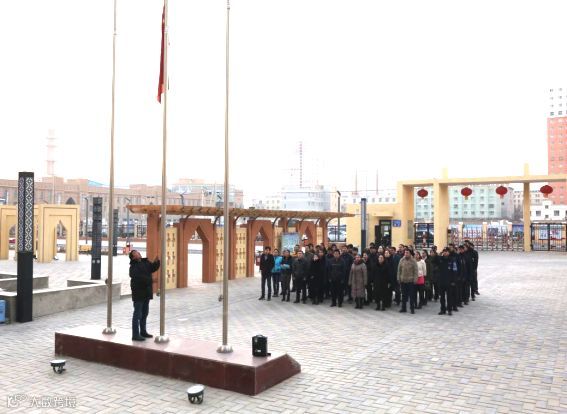 2018年4月9日,上午,9点30分,新疆和田地区洛浦县双创基地内物流园区和电子商务公共服务中心各入驻企业领导和职工及附近便民警务岗亭的警务人员,准时参加升国旗仪式仪式。