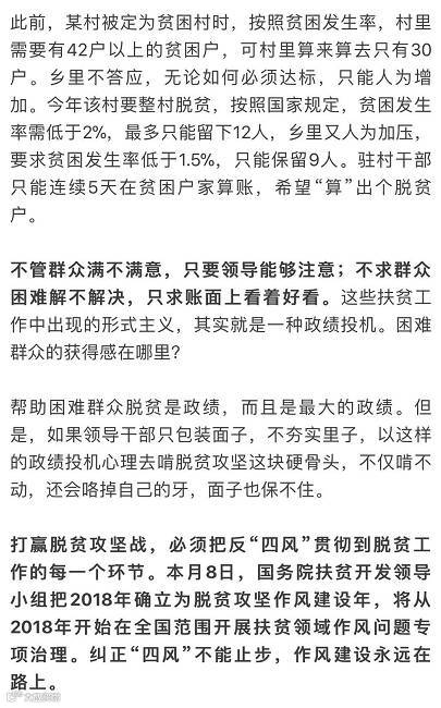 近期,人民日报记者走访调查就发现,有些地方在制定扶贫政策、考核评估、督查巡查等方面依然不严不实,搞面子工程。扶贫工作中的“形式主义”表现值得警惕。