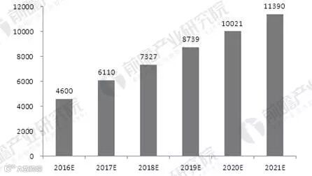 2016-2021年农村网购市场规模预测(单位:亿元)