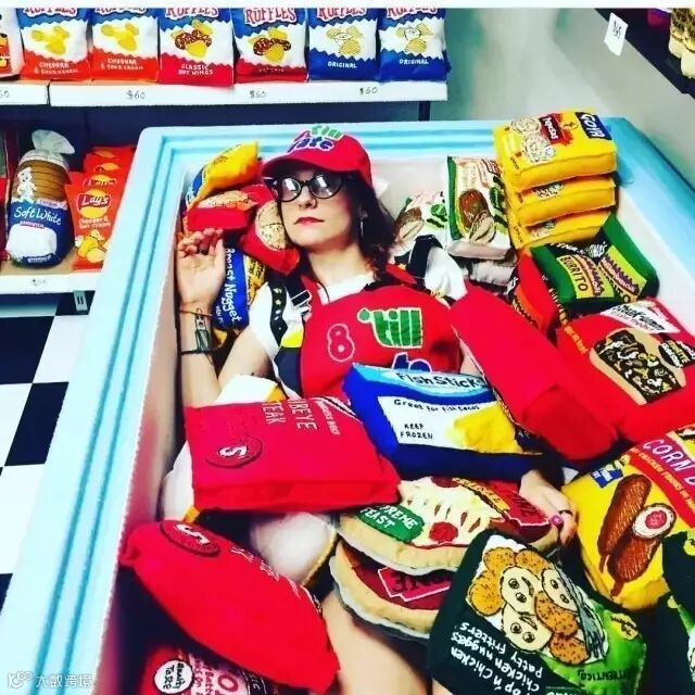 也就是说,这里的所有商品…吃的用的玩的…全是假的!而下面这个看起来傻里傻气的小姐姐——Lucy Sparrow 就是这些毛毡艺术品的创作者