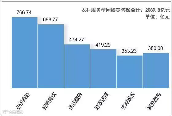二、农村在线旅游和餐饮增势迅猛,助力农村服务型高速增长。2017上半年农村服务型网络零售额同比增速高达44.4%,高出实物型网络零售额增速(34.3%)10.1个百分点,服务型在农村网络零售总额中占比达到了38.9%,比去年同期提升了1.7个百分点,服务型带动农村网络零售额增速达到了16.5个百分点。在服务型行业中,在线旅游、休闲娱乐、在线餐饮引领服务型电商发展,分别实现网络零售额841.9、81.7、689.5亿元,同比增长率分别达到61.6%、58.3%、56.6%,其中在线旅游同比增速高出全国23.4个百分点,大幅超过全国发展水平;服务型电商中的在线旅游、在线餐饮行业直接带动农村网络零售额增速分别达到了8.2、6.4个百分点,成为统计的19个行业中对增速贡献最大的2个行业。