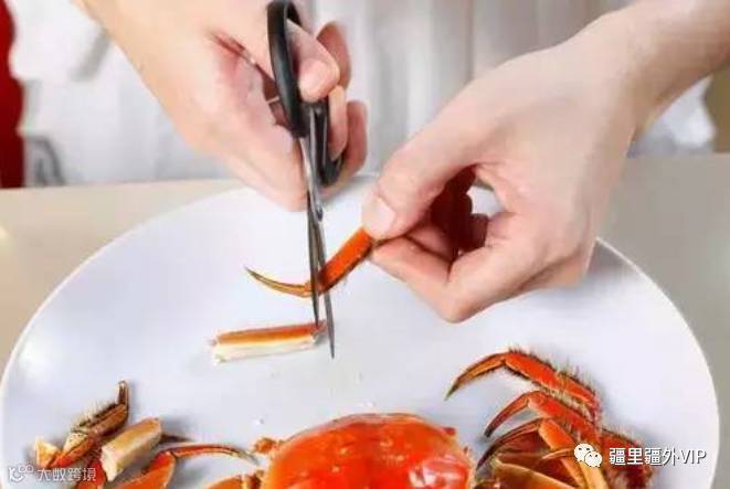 第七步:用剪刀把蟹腿剪成三截,最末一截蟹脚尖可充当工具。