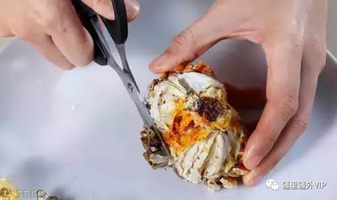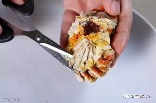第十步:用手往相反的方向掰两只钳脚,钳壳就完整的分开了,剪开钳子两边,就可以挑出肉来享用。