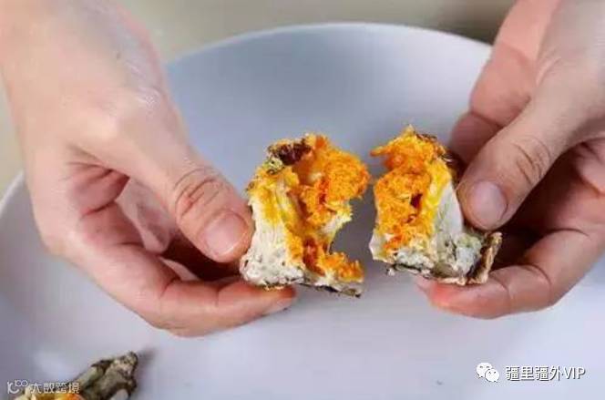 第五步:用勺柄将蟹身中间一个呈六角形的片状物,也就是是蟹心挑出来丢弃,即可享用蟹黄。(据说蟹心极寒,身体虚弱的人吃了可能会闹肚子。)