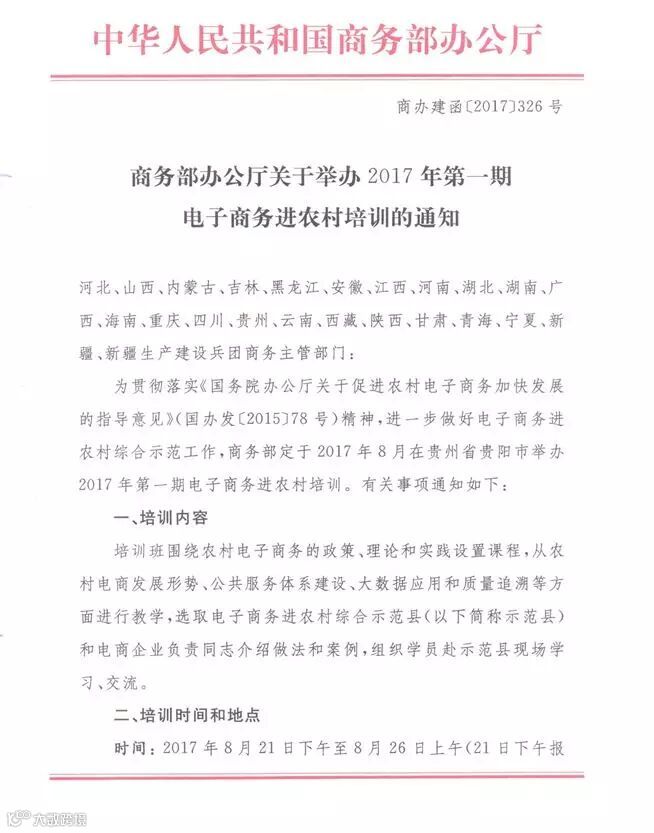 导读 为进一步做好电子商务进农村综合示范工作,商务部定于2017年8月在贵州省贵阳市举办2017年第一期电子商务进农村培训。