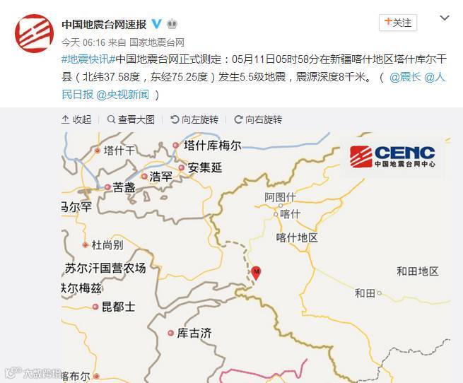 2017年5月11日凌晨6:16分,中国地震台网发布消息称:05月11日5:58在新疆喀什地区塔什库尔干县(北纬37.58度,东经75.25度)发生5.5级地震,震源深度8千米。