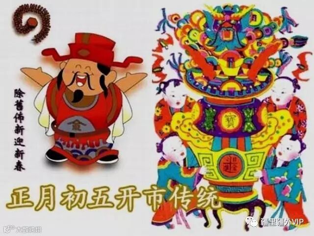 旧俗春节期间大小店铺从大年初一起关门,而在正月初五开市。俗以正月初五为财神圣日,认为选择这一天开市必将招财进宝。