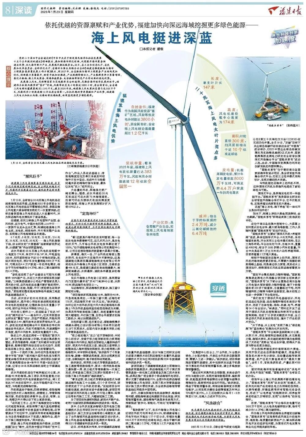 近日,《福建日报》刊发报道,聚焦我省海上风电产业高质量发展实践,其中重点展现了福能海峡主动作为,在风电领域的突破性成就与创新实践,创造海上风电建设“超级速度”,更以智慧风场建设赋能高效运维,用技术创新与实干担当,为福建海上风电从浅海向深远海拓展、助力“双碳”目标落地注入强劲动力,彰显了国企担当与科技实力。