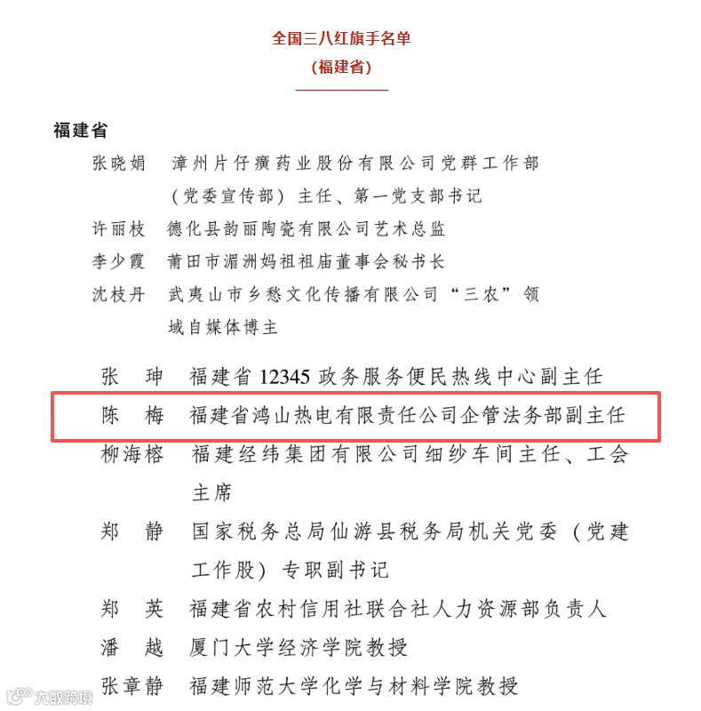 其中,福建能源石化集团陈梅荣获“全国三八红旗手”称号。她以巾帼之志书写奋斗篇章,将激励更多职工在各自岗位上迎难而上、砥砺前行,为集团高质量发展注入源源不断的向上力量。