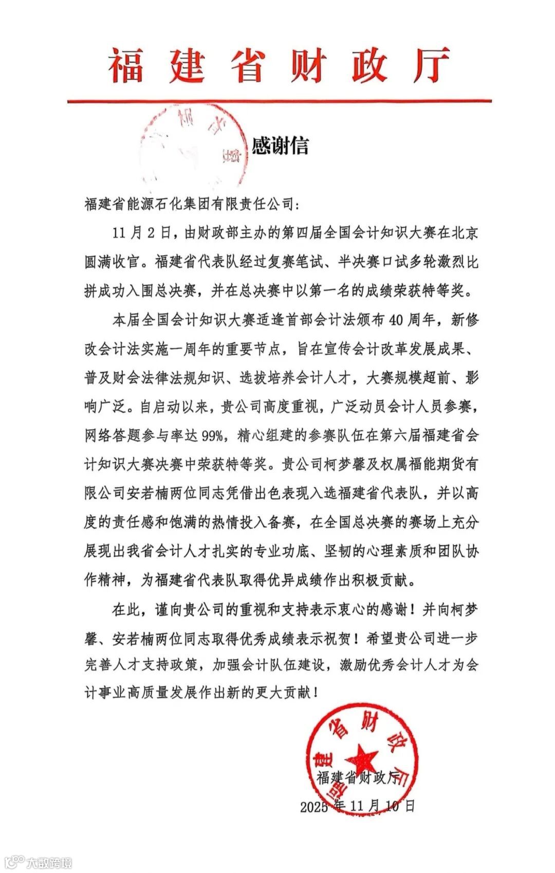11月10日,福建省能源石化集团收到福建省财政厅发来的感谢信,对集团及参赛员工在第四届全国会计知识大赛、第六届福建省会计知识大赛中作出的积极贡献给予高度肯定和大力感谢。