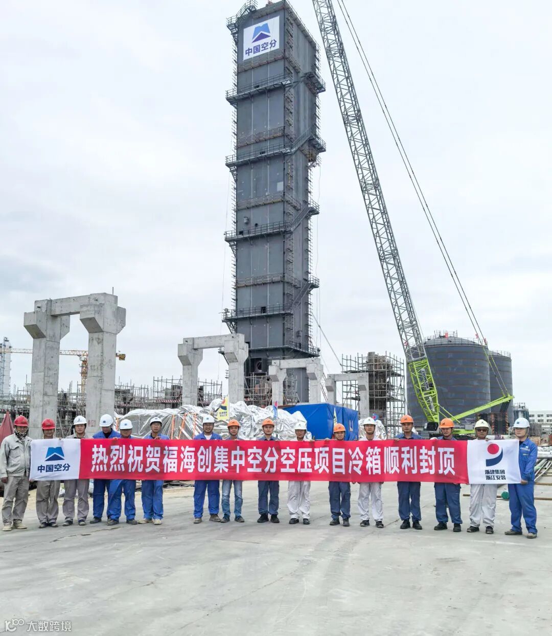 日前,福海创集中空分空压项目空分装置冷箱顺利完成封顶作业,这座高达67米的核心设备巍然成型。