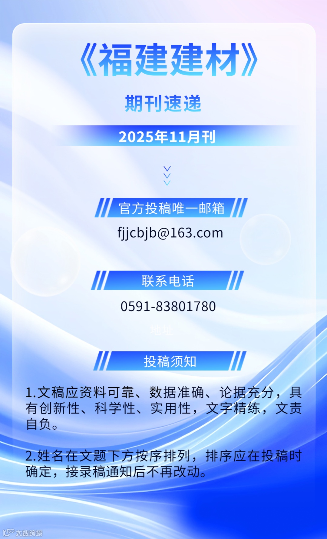 《福建建材》期刊是一份全国性科技学术期刊、福建省优秀科技期刊、《中国期刊全文数据库》和《中文科技期刊数据库》的全文收录期刊、《中国学术期刊综合评价数据库》的统计源期刊,由福建省能源石化集团有限责任公司主管,福建能源报业有限公司主办,大16开本、月刊,每月20日出版。国内统一连续出版物号:CN35-1107/TU,国际标准连续出版物号:ISSN1004-4728。邮发代号:34-31。欢迎订阅!欢迎投稿!投稿唯一邮箱fjjcbjb@163.com