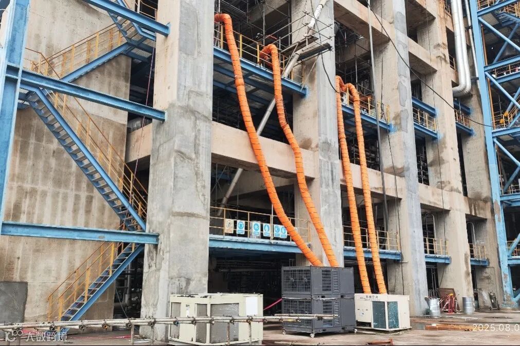 为突破行业检修高温作业共性难题,福海创首次自主引用大功率移动式工业空调,定制风管将冷风精准输送至反应器内部核心作业区,显著降低了作业温度。