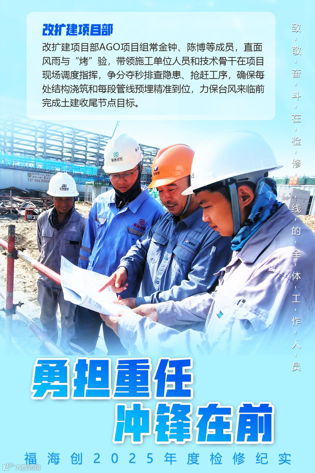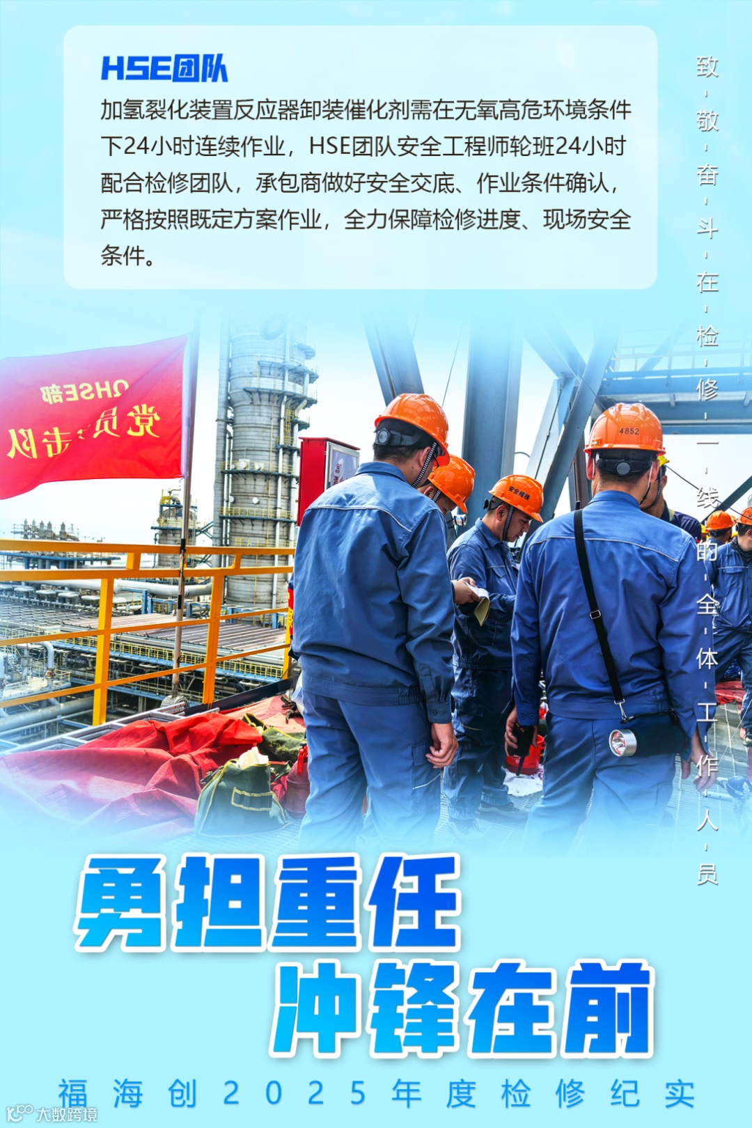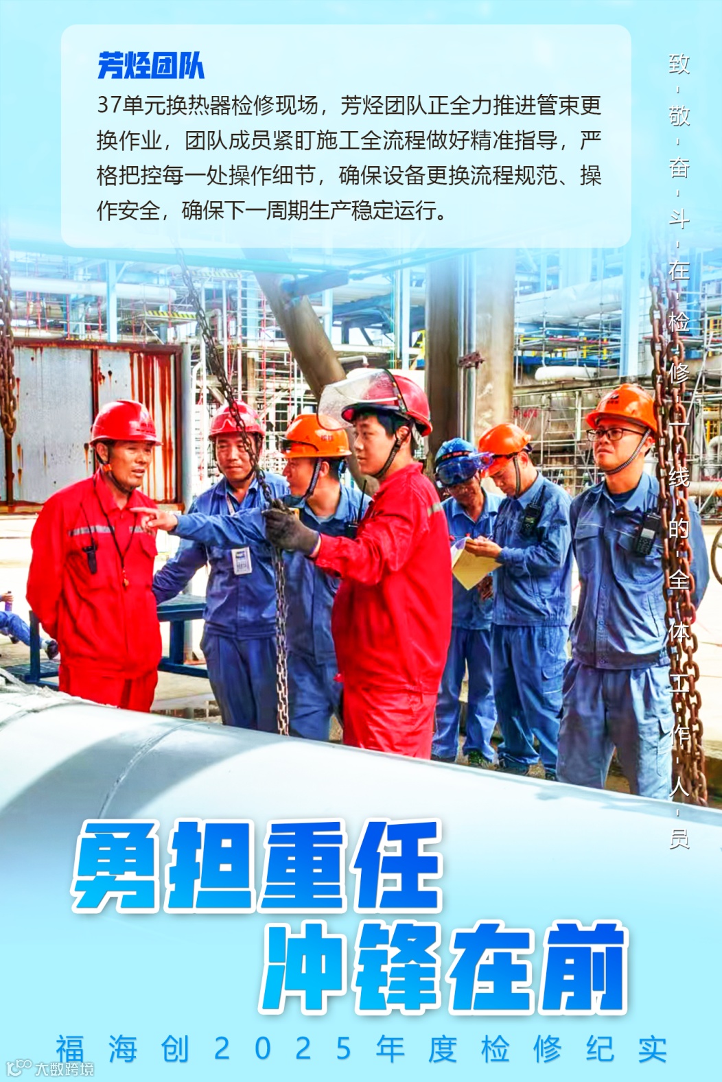当前,正值福海创检修关键期。此次检修涵盖特种设备定检、原料适应性改造、芳烃节能改造等重点项目,关乎装置长周期安全运行,任务艰巨、节点紧迫。福海创人以“筑牢安全防线、严控质量标准、抢抓检修进度”为目标,发挥党组织战斗堡垒作用、党员先锋模范作用,在检修现场,以行动诠释责任与担当,推动福建能源石化集团高质量发展。