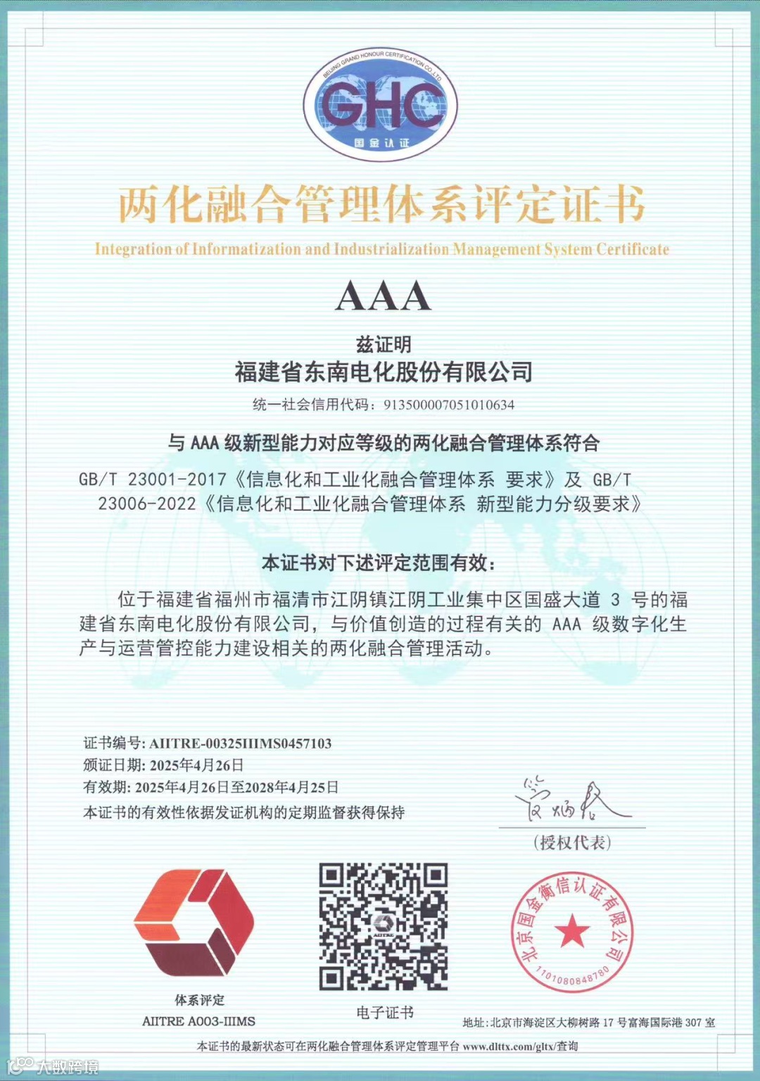 近日,东南电化公司正式通过国家两化融合管理体系AAA级认证,成为福建能源石化集团首家获此殊荣的权属企业,标志着公司在信息化与工业化深度融合领域迈入国内领先行列,为行业数字化转型树立了新标杆。