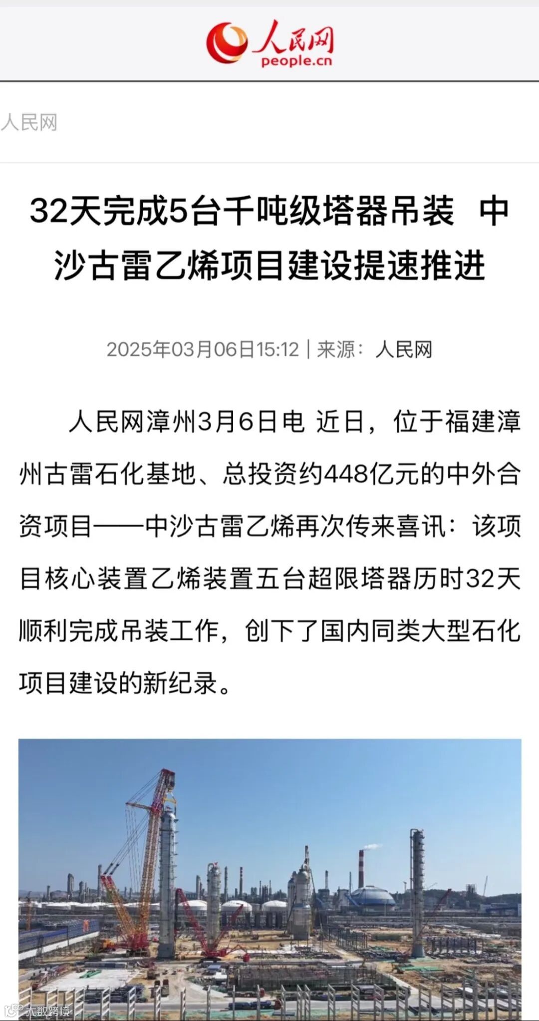 3月5日、6日,人民网、福建卫视新闻、“福建发布”等报道了中沙古雷乙烯项目乙烯五塔安装创下国内新纪录!