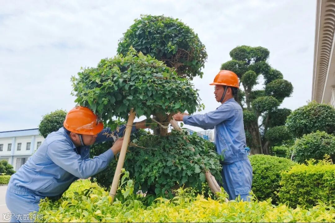 福海创行政办公室员工正对厂区高大绿植树木进行固定,做好防台风准备工作。(蔡春苗)
