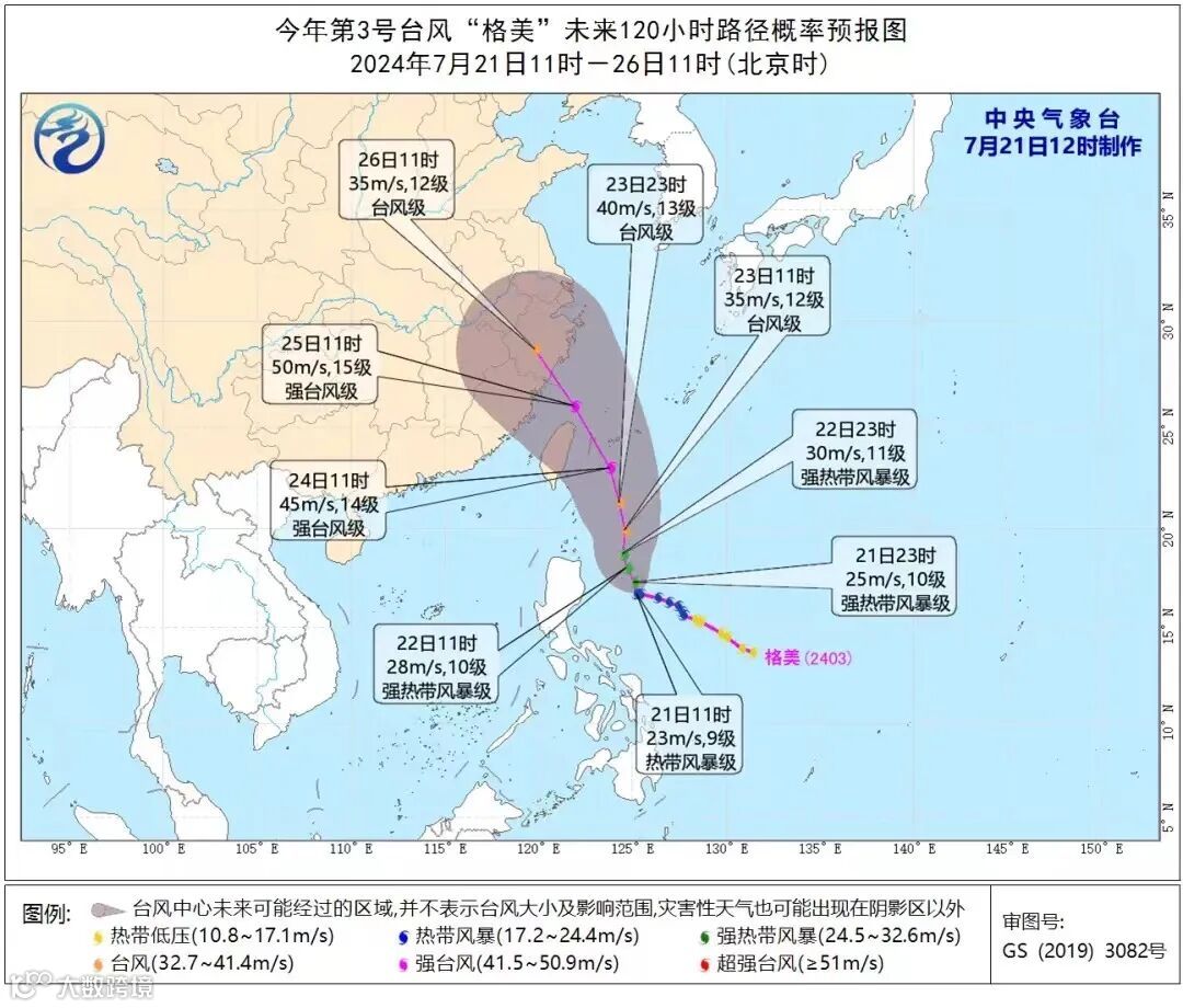 今年第3号台风“格美”预计将于25日下午到上半夜在福建登陆,将给福建带来严重风雨影响。福建气象台7月23日11时将“台风预警”提升为Ⅲ级,根据《福建省防汛抗旱防台风应急预案》,省防指决定23日11时提升防台风应急响应为Ⅲ级。