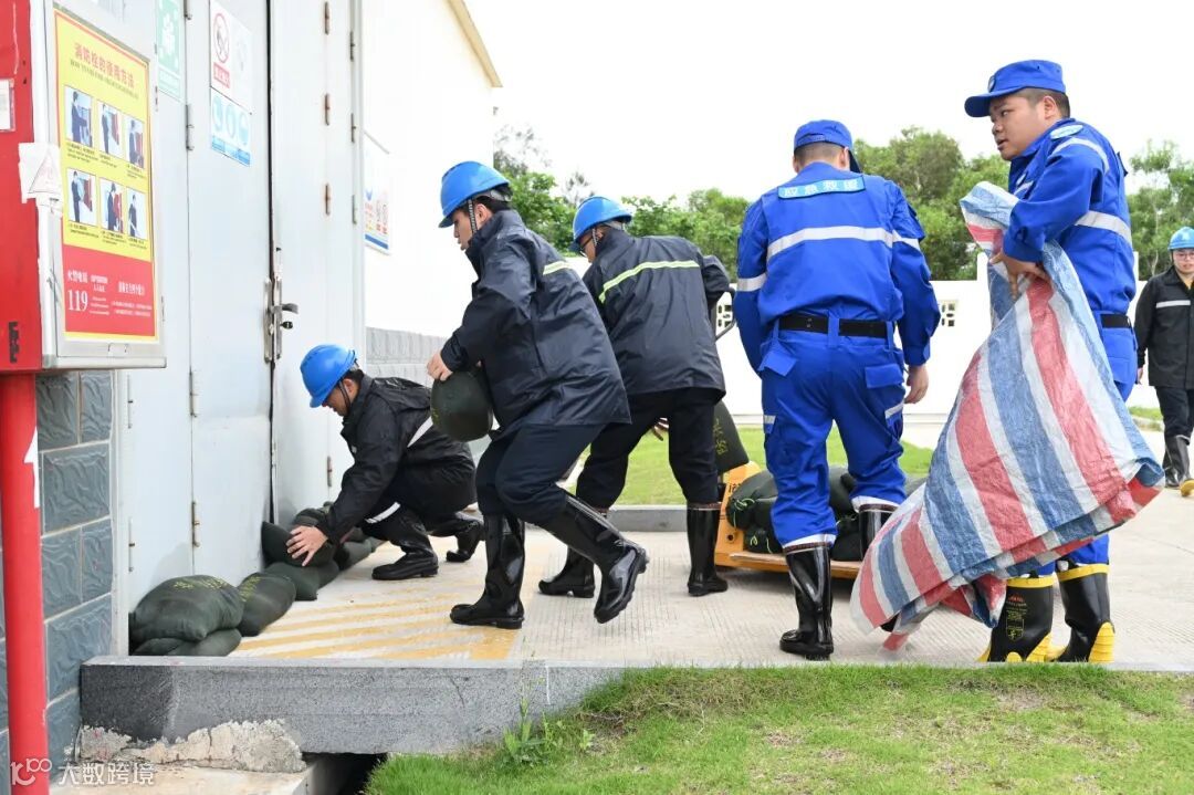 福能新能源公司员工在加强设备巡检的同时,积极排查安全隐患,利用沙袋堆筑防水墙,防止因积水影响电力设备的安全运行,确保在极端天气条件下的电力供应。(林晓东)