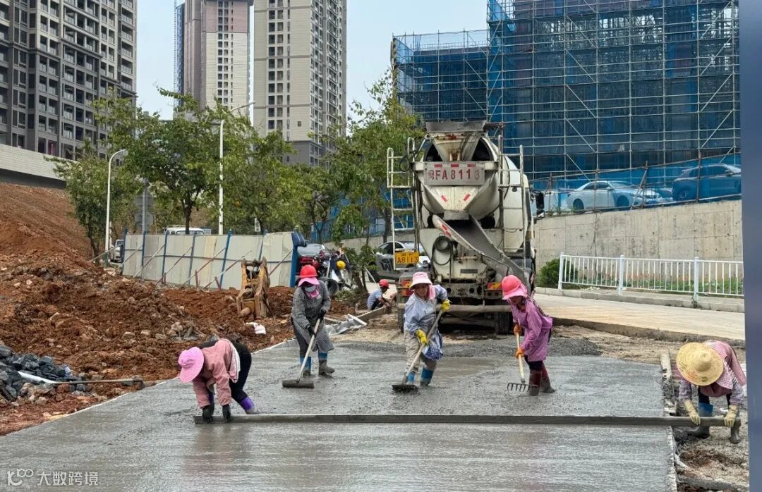 龙岩美伦·生态城施工人员正在进行混凝土浇筑工作。(徐宗鹭)