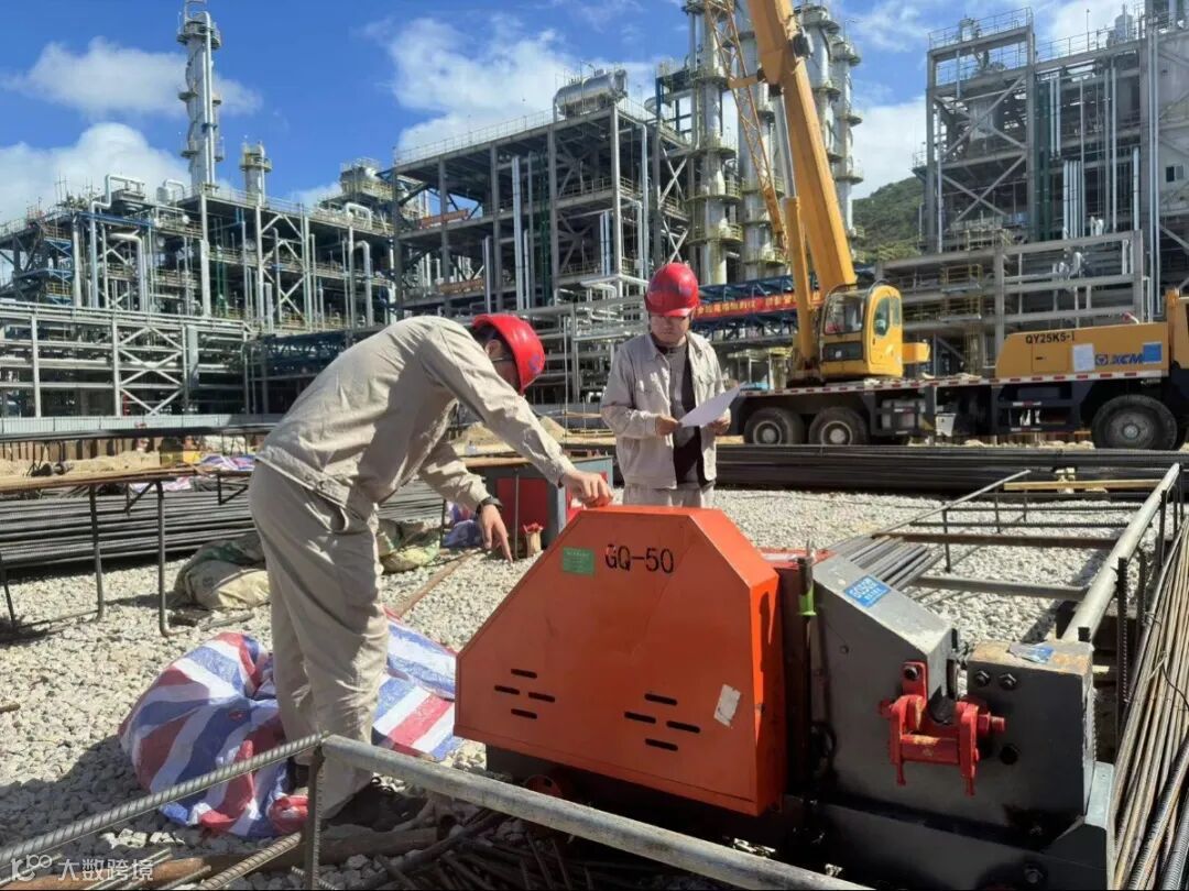 碳五碳九分离及下游新材料项目监理团队正在测量、复核灌注桩桩位偏差,对进场的机具设备进行“五检”,严守安全红线。(设计院)