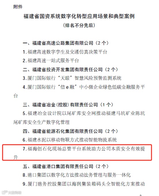 自成立之初,福海创便高度重视信息化建设和数字化转型工作,成立了信息化建设推进委员会,推动转型工作。按照集团统一规划、分步实施的原则,公司以业务驱动为核心,聚焦各领域的创新突破,信息化现已成为公司决策管理、降本增效、流程重构和风险监控的关键工具,推动公司在安全管理方面取得长足进步,并于2022年8月荣获“福建省国资委国企数字化转型应用标杆”称号。