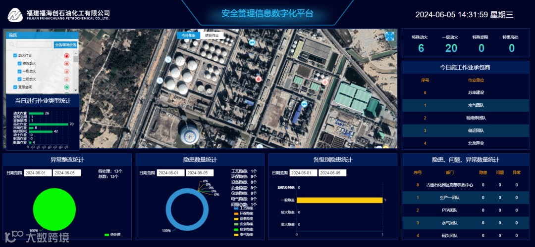 针对传统化工企业在安全风险管控中常见的“看不住、管不全、管不好”的问题,福海创“安全管理数字化”项目集成了物联网、云计算、数字地图、北斗定位、AI等新一代信息技术。引入杜邦安全管理实践,建设企业安全管理数字化平台,重点强化了安全基础管理、双重预防机制、特殊作业管理、智能巡检等功能。这一平台在感知、监测、预警、处置、评估等多个层面为企业安全管理赋予了新动能,形成了一套满足福海创发展需求的安全管理体系。