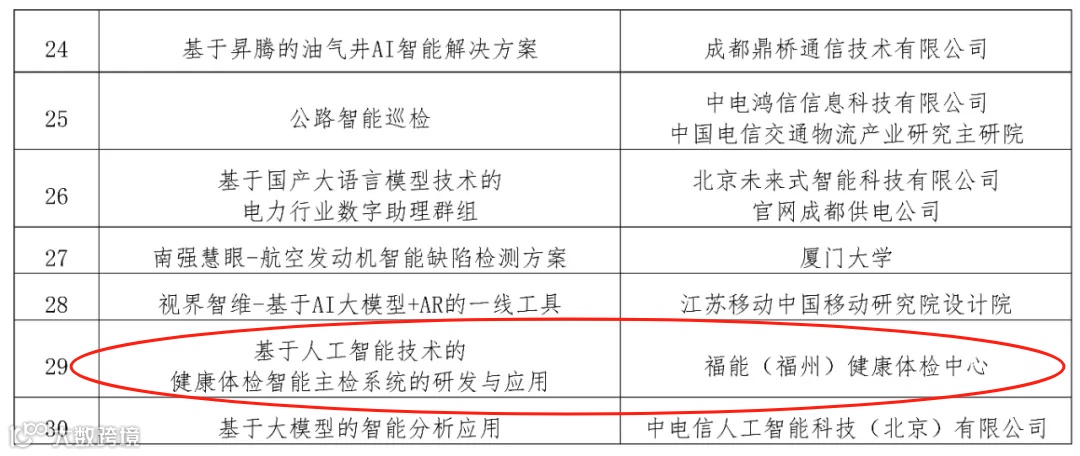 5月12日,2024数字中国创新大赛·人工智能赛道复赛结果发布,福能体检中心提交的参赛作品“基于人工智能技术的健康体检智能主检系统的研发与应用”入选行业应用赛题前30强,纳入数字中国创新大赛·人工智能赛道年度“数智百景”集。