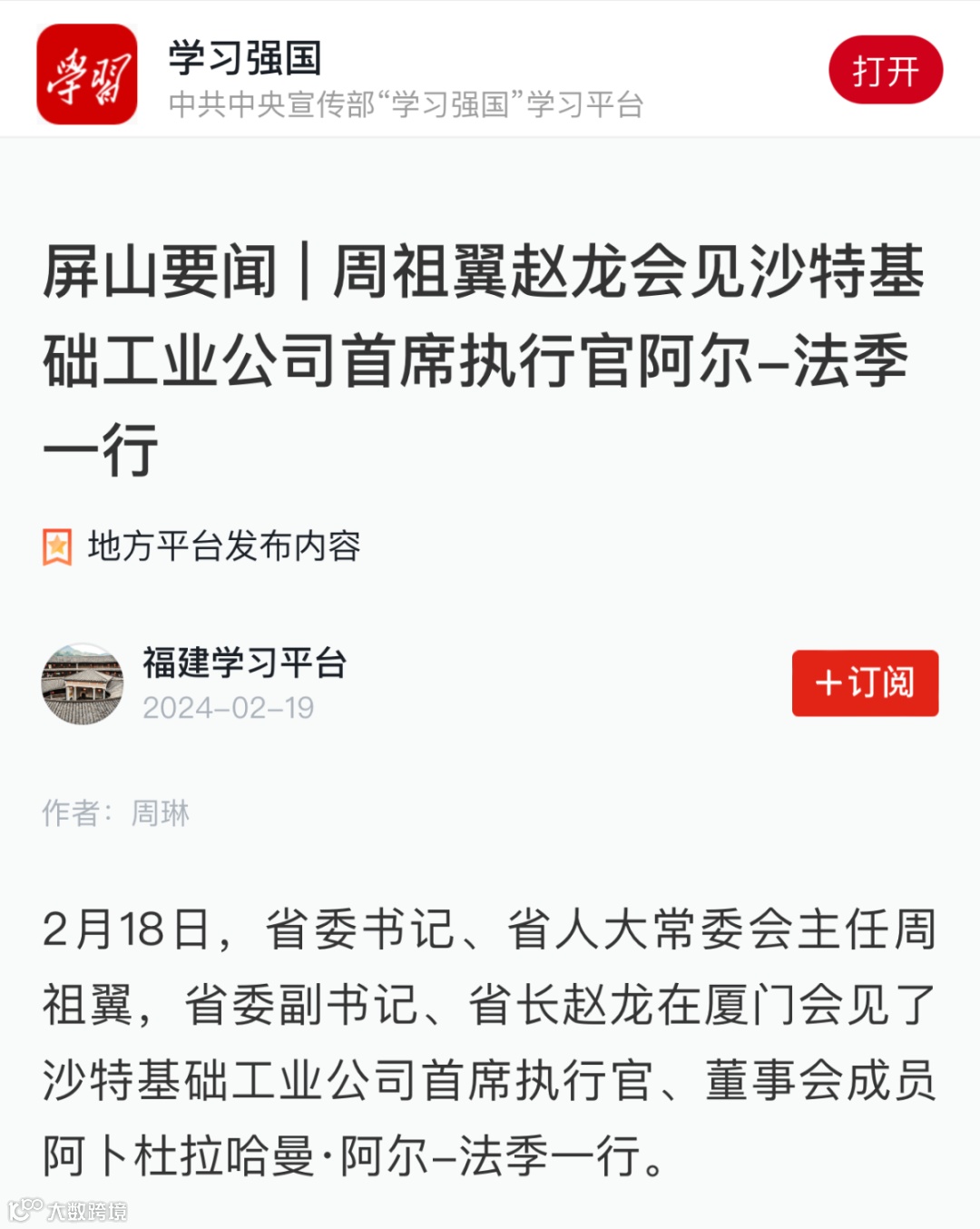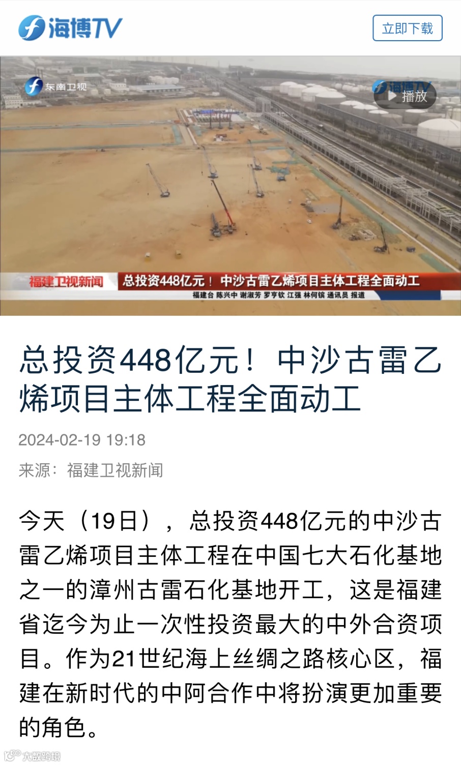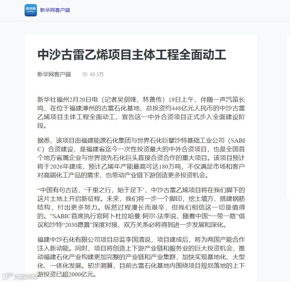 国务院新闻办公室、中央广播电视总台、新华社、人民网、中国新闻网、学习强国、福建日报、福建发布、福建卫视新闻等媒体对此广泛关注,纷纷在第一时间予以重点关注、报道,中沙古雷乙烯项目影响力持续提升。其中,中央广播电视总台综合频道“晚间新闻”、中文国际频道“中国新闻”、新闻频道“朝闻天下”连续播发新闻报道,新华社以英语、俄语、阿拉伯语等多个语种向全球推介,并被国务院新闻办公室等多个媒体采用。