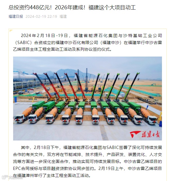 2月19日上午,在位于漳州的古雷石化基地,总投资约448亿元人民币的中沙古雷乙烯项目主体工程全面动工。这一国家重大外资项目开启了新的篇章。