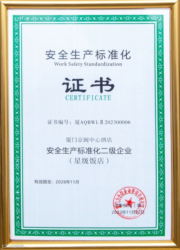 近日,厦门京闽中心酒店高分通过由厦门文旅局组织的星级饭店安全生产标准化建设达标评定,成为厦门饭店业唯一一家获得“安全生产标准化二级企业”的酒店。