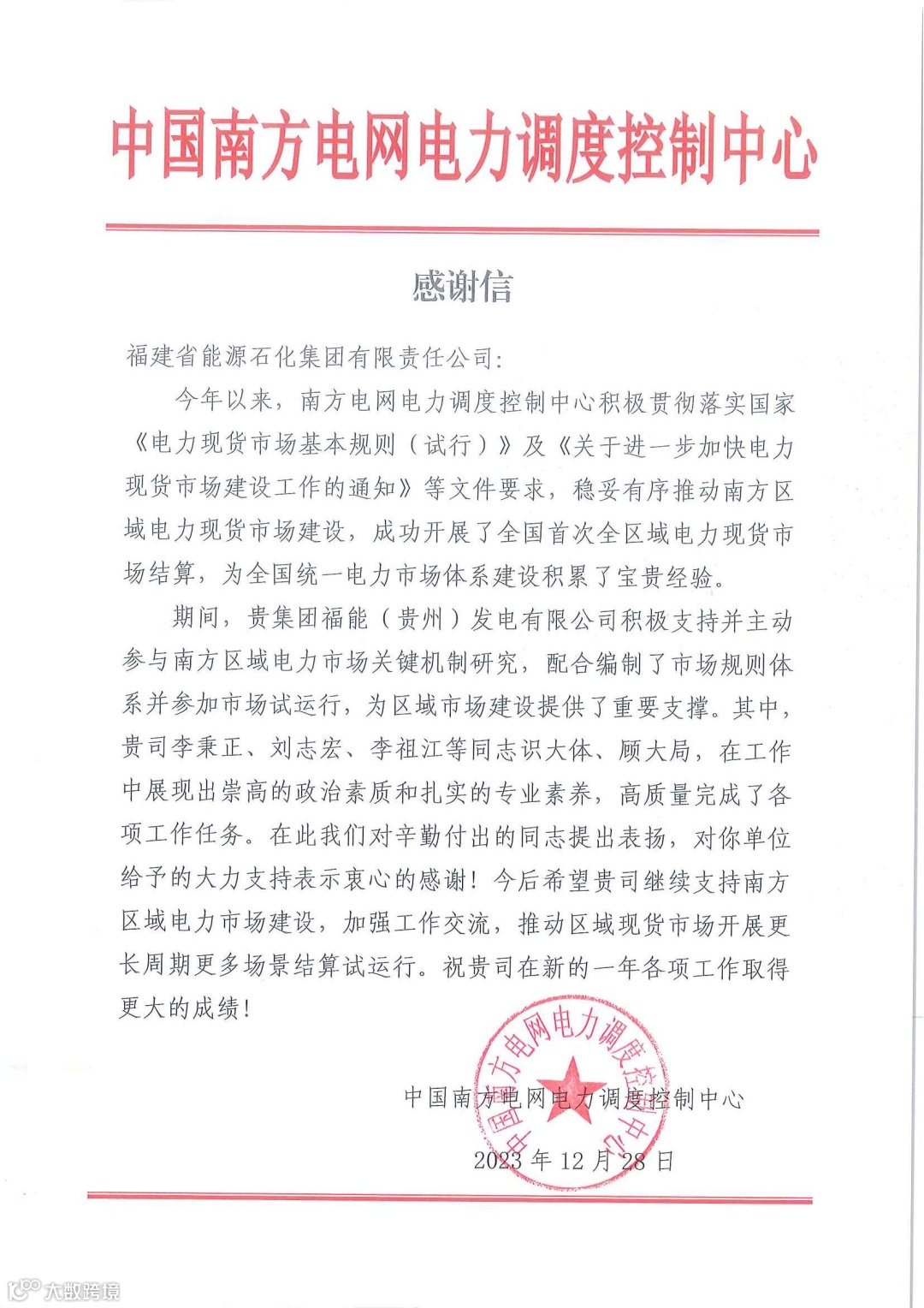“今年(2023年)以来,贵集团福能(贵州)发电有限公司积极支持并主动参与南方区域电力市场关键机制研究,配合编制了市场规则体系并参加市场试运行,为区域市场建设提供了重要支撑……在此,对你单位给予的大力支持表示衷心的感谢!”