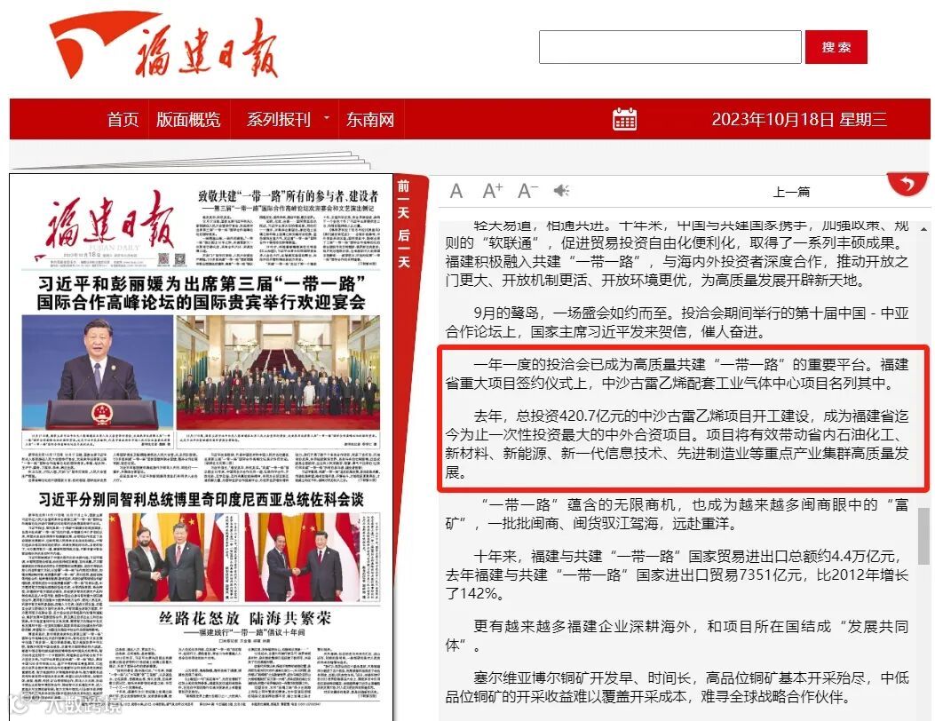 18日,福建日报头版刊发了《丝路花怒放 陆海共繁荣——福建践行“一带一路”倡议十年间》的文章,特别提到了福建省迄今为止一次性投资最大的中外合资项目——中沙古雷乙烯项目。
