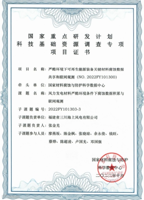 近期,三川风电公司参与的《严酷环境下可再生能源装备关键材料腐蚀数据收集与联网观测》科创项目正式获得“国家材料腐蚀与防护科学数据中心”颁发的《国家重点研发计划科技基础资源调查专项项目证书》,标志着该公司正式以课题单位参与国家级重点研发项目。