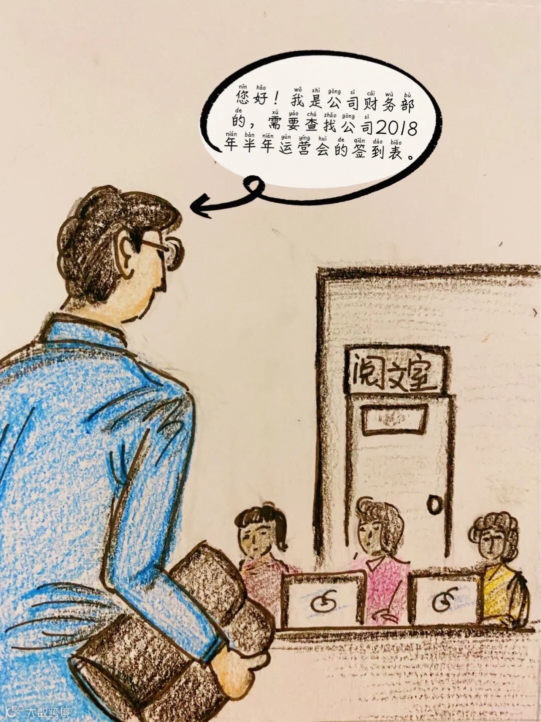 大家各自工作忙碌中,财务部沈海波急匆匆的跑到档案室:“你好!我需要查找公司2018年半年运营会的签到表!”